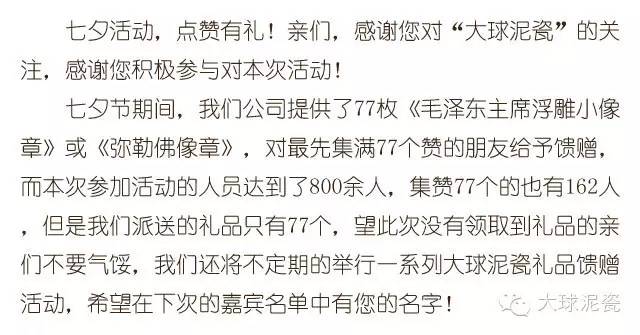 我們郵寄天使在近三天會(huì)把77枚《毛主席浮雕小像章》或《彌勒佛像章》請(qǐng)到您府上。感謝您傳遞“大球泥瓷”的美好祝愿,愿所有人天天“七夕”,愿天下有情人終成眷屬!