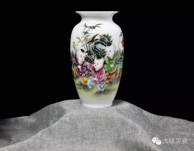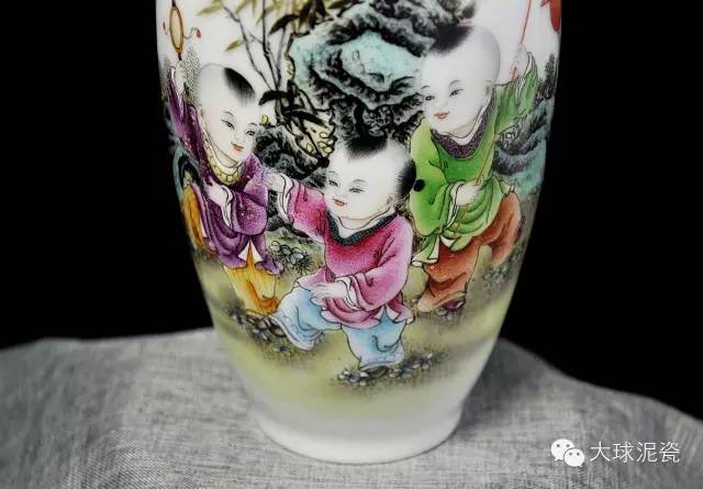 《歡天喜地》藕瓶,以大球泥為主要原材料,景德鎮省級工藝美術大師創作,與釉上粉彩工藝相結合,使得瓷器上的圖案,豐富多彩,色澤鮮艷,立體感強。