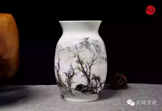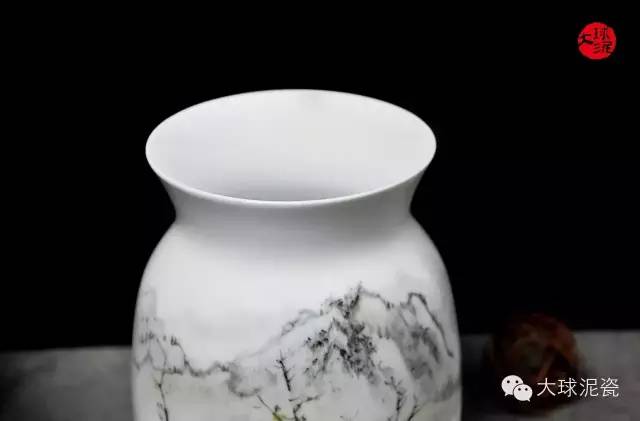 《江南春早》瓶,以大球泥為原材料,由工藝美術(shù)大師鄧劍波創(chuàng)作。作者繪畫出一場(chǎng)春雨后自然美景,山林錯(cuò)落有致,樹(shù)木生機(jī)勃勃,展現(xiàn)大自然的無(wú)限美麗風(fēng)光。