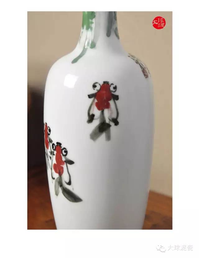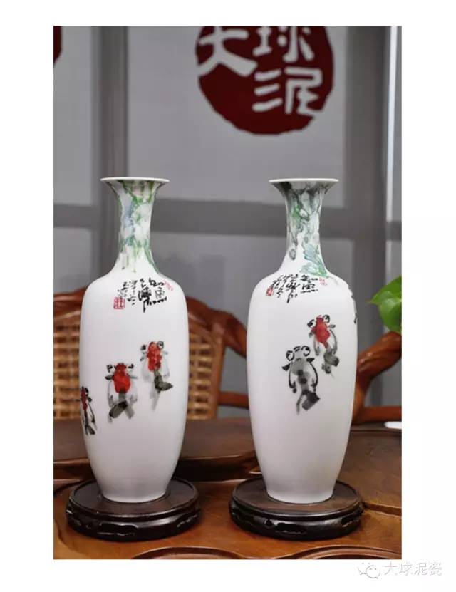 《知魚之樂》柳葉瓶,作者采用釉下彩技藝,以寫意手法在大球泥瓷瓶上繪畫魚兒力爭上游的情景。器形簡約優雅,瓶身直挺,大氣而精致。這件藝術作品以粗線條展現金魚的形體本質,大膽而隨性,整體畫面又摒棄了任何輔助裝飾,回歸于魚的本身。點睛之筆,看似隨意而落,卻是神來之墨,意韻靈動。這些粗狂線條構成的意象展示在大球泥瓷上,使人猶如品讀現代主義詩。 “子非魚,焉知魚之樂”出自《莊子.秋水》。該句流傳千古,具有深刻的哲學蘊義。通常來說,它的意思主要是指人心永遠是屬于個人的,一個人的快樂、悲傷只有自己才能真正感悟,外人即使再了解,也無法真正感同身受。這件大球泥瓷藝術品以此為題材,可謂妙韻天成,是由北方地產大亨特別定制,指定創作。
