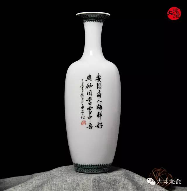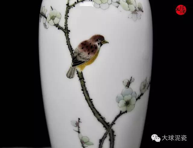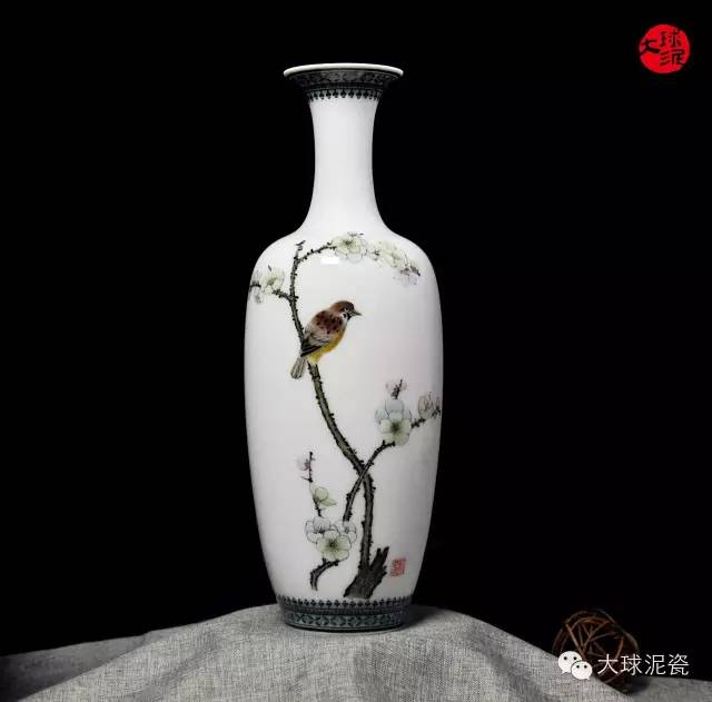 《凌寒飄香》柳葉瓶,以大球泥為原材料,由省級工藝美術大師黃永平創作。胎體潔白細膩,釉色光滑瑩潤。素雅的畫面質感,美感十足。雀鳥枝頭相伴,生動活潑,和諧美好。畫面層次分明清晰,具有較高的觀賞價值。