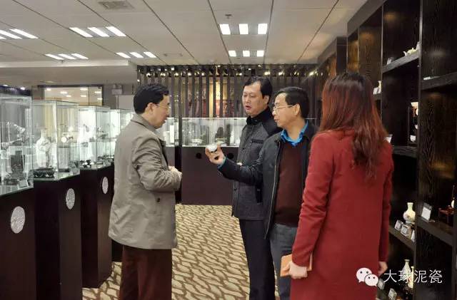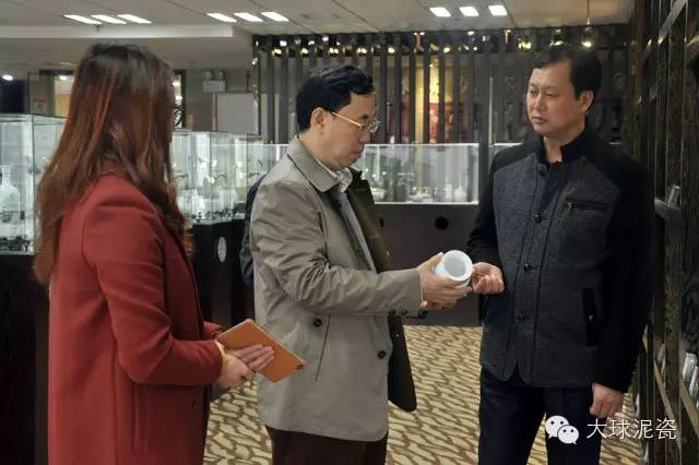 唐主任一行一邊參觀了大球泥瓷精品展廳,一邊仔細詢問大球泥原料的形成和利用以及研究開發和生產經營狀況。公司董事長滕召華就領導們關心的大球泥原料的稀缺及公司的創作銷售現狀和大球泥瓷藝的未來發展做了匯報。