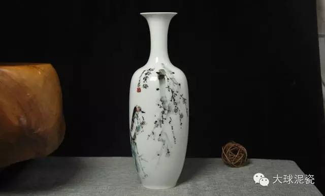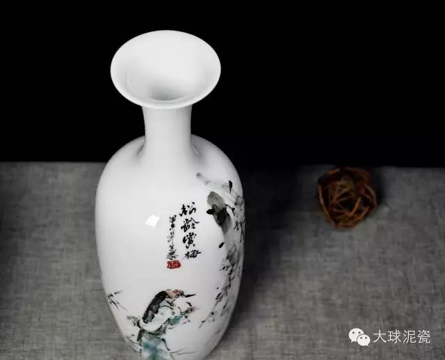 寒冬臘月,天寒地凍,大雪紛飛,天地間唯有梅花傲骨錚錚,凌寒獨(dú)放。也許是窗外的這一樹梅花盛放得太熱烈太激昂,引得屋內(nèi)的聊齋先生——蒲松齡毅然放下手中的筆墨,走到梅樹下抬頭凝望。梅花與他一樣,都是豐富的,卻又都是孤獨(dú)的。梅花的品格縱是千古以來的文人墨客都無法吟誦得淋漓盡致,而聊齋先生的八斗才氣、滿腔熱血在科舉制度的框架下也無法盡情施展。面對(duì)此情此景,紛飛的思緒里或有對(duì)剛才伏案所作文章的靈機(jī)一動(dòng),更多的應(yīng)該是對(duì)自身命運(yùn)不濟(jì)、懷才不遇的深思。《松齡賞梅》瓶便是中國陶瓷藝術(shù)大師閻先恭先生以此畫面為靈感,所創(chuàng)作出的大球泥瓷珍品。