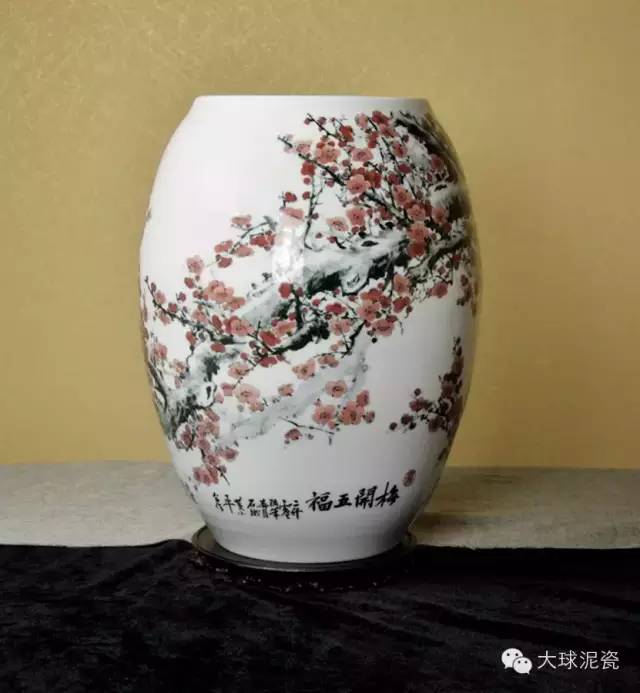 《梅開五福》瓶,由工藝美術師許石斌先生與黃小平先生于2006年共同創作。既有瓷器的玲瓏剔透,也有中國畫的意境深遠。無論是瓷藝還是畫法運用均匠心獨運、獨具一格。于2008年獲得“張家界”杯第二屆湖南工藝美術精品大獎賽銀獎。