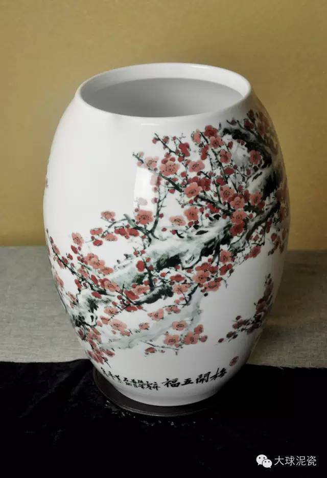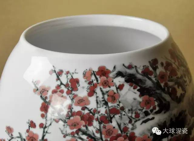 細觀此作品,運用了釉下五彩的工藝手法,圓身鼓腹,器形渾圓飽滿,線條流暢,顏色鮮艷奪目,吉祥喜慶,別有一番風韻。畫面中的梅樹枝干盤根錯節,蒼勁有力。細枝層出,短密交錯。梅花傍枝而生,層層簇簇,競相開放,好一副生機勃勃的景象。