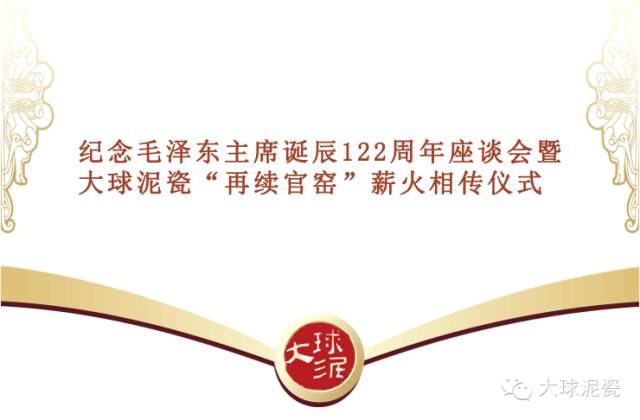 2015年12月26日是毛澤東主席誕辰122周年紀念日,也是大球泥瓷藝新生產基地窯爐點火的日子。為緬懷偉大領袖毛主席,弘揚釉下五彩“毛瓷”技藝,湖南大球泥瓷藝有限公司將于12月26日舉辦“紀念毛澤東主席誕辰122周年座談會暨大球泥瓷‘再續官窯’薪火相傳儀式”。