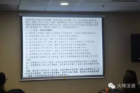副總張萍發布了公司2015年度總結和2016年經營方案。2016年公司總目標為全年實現大球泥瓷及優質泥瓷產值10000萬元,銷售收入5000萬元。爭取在五年內集團公司產值超過10億,并將自身打造成為世界藝術陶瓷的一個知名品牌。