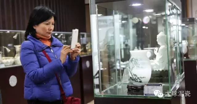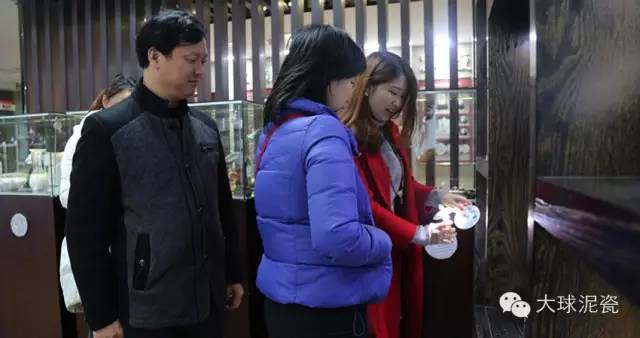 王主任首先參觀了大球泥瓷藝的精品展示廳,第一次見到大球泥瓷廬山真面目的王主任一走進展廳,便被眾多光彩熠熠的作品吸引住了目光。她一邊仔細地觀賞每一件作品,一邊拿起手機興致勃勃地拍照,說要把這么精美的瓷器發到朋友圈和好友們一起分享。