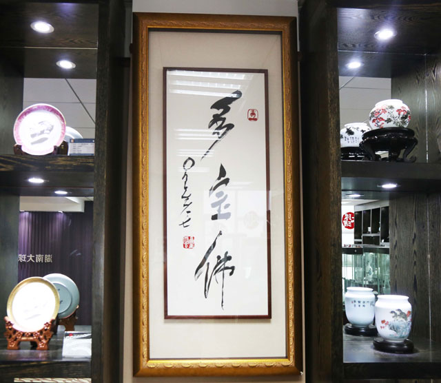 2014年3月14日,在旅美畫家李自建的引薦下,滕董有幸與星云大師結緣,并將001號《釋迦牟尼佛瓷塑像》及《春滿人間》雙面瓷板畫捐贈給星云大師并永久珍藏于佛光山。星云大師特地為《釋迦牟尼佛瓷塑像》題寫墨寶《多寶佛》。曾有人以200萬的價格請滕董割愛墨寶,但由于對大師的尊敬、敬仰,他謝絕了。墨寶《多寶佛》上承載了星云大師的佛心,《釋迦牟尼佛瓷塑像》也承載了與大師的佛緣。