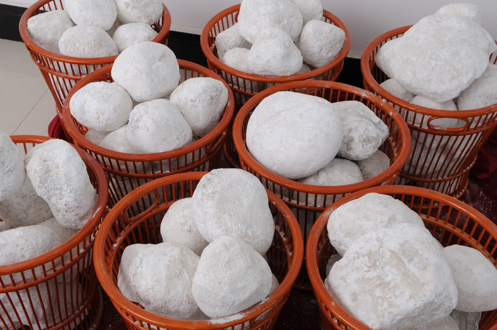 大球泥出自于湖南雪峰山青界嶺,屬于燕山早期第一次侵入的花崗巖。大球泥形成有三個條件,一是在偉晶巖礦帶上,二是地殼運動形成球狀,三是具備風化條件。大球泥是偉晶巖風化物,為橢圓球狀,通體耀眼雪白,直徑均為10-20cm左右,呈蜂窩狀排列聚集于一個框狀的礦體中。