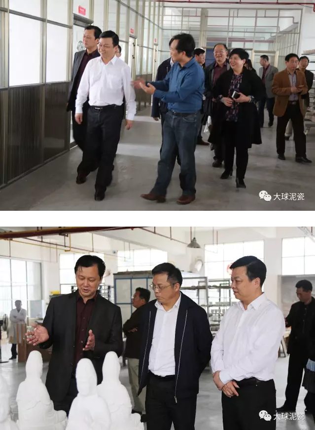 譚校長一行在董事長滕召華的引導下參觀了大師原創工作室、瓷雕創作室等。胡書記主動介紹到大球泥瓷雕《觀世音》作品藝術創作水準高、收藏價值大、市場前景趨勢很好,隨行人員紛紛點頭稱贊。
