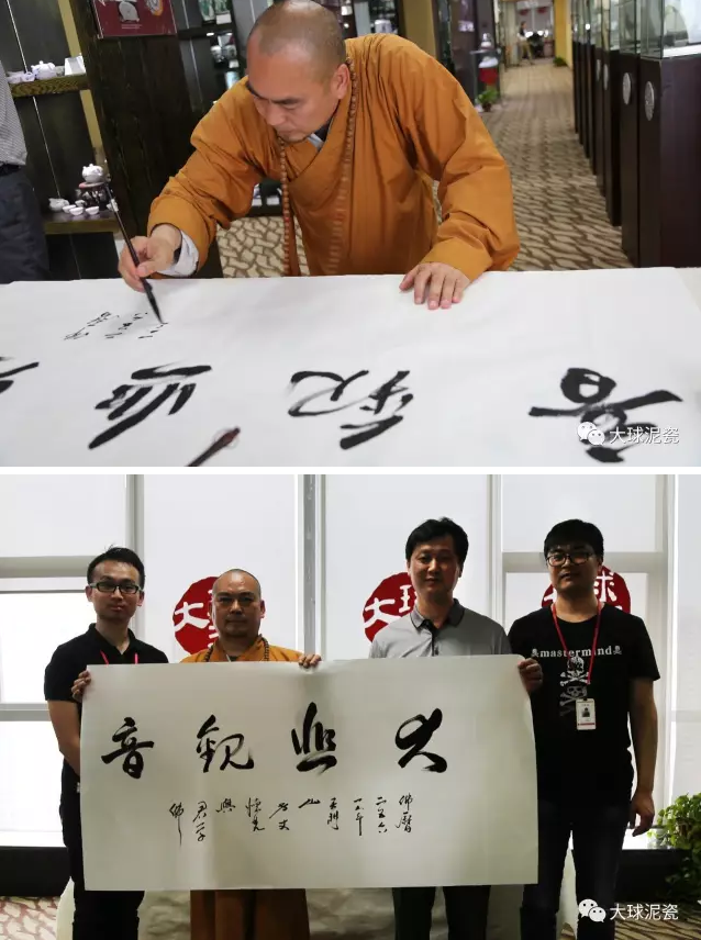 《觀世音》瓷雕得到了懷梵大師的好評,并現場贈送墨寶表達對大球泥瓷藝的支持。