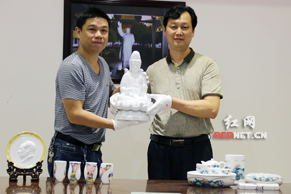 大球泥董事長滕召華(右)向醴陵陶瓷博物館捐贈《觀世音》瓷塑像一尊。