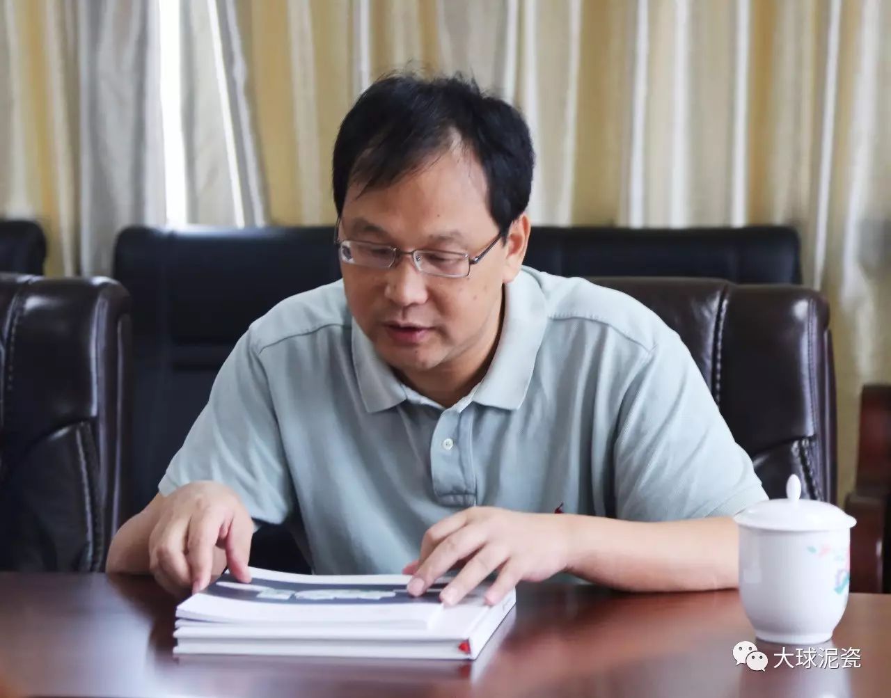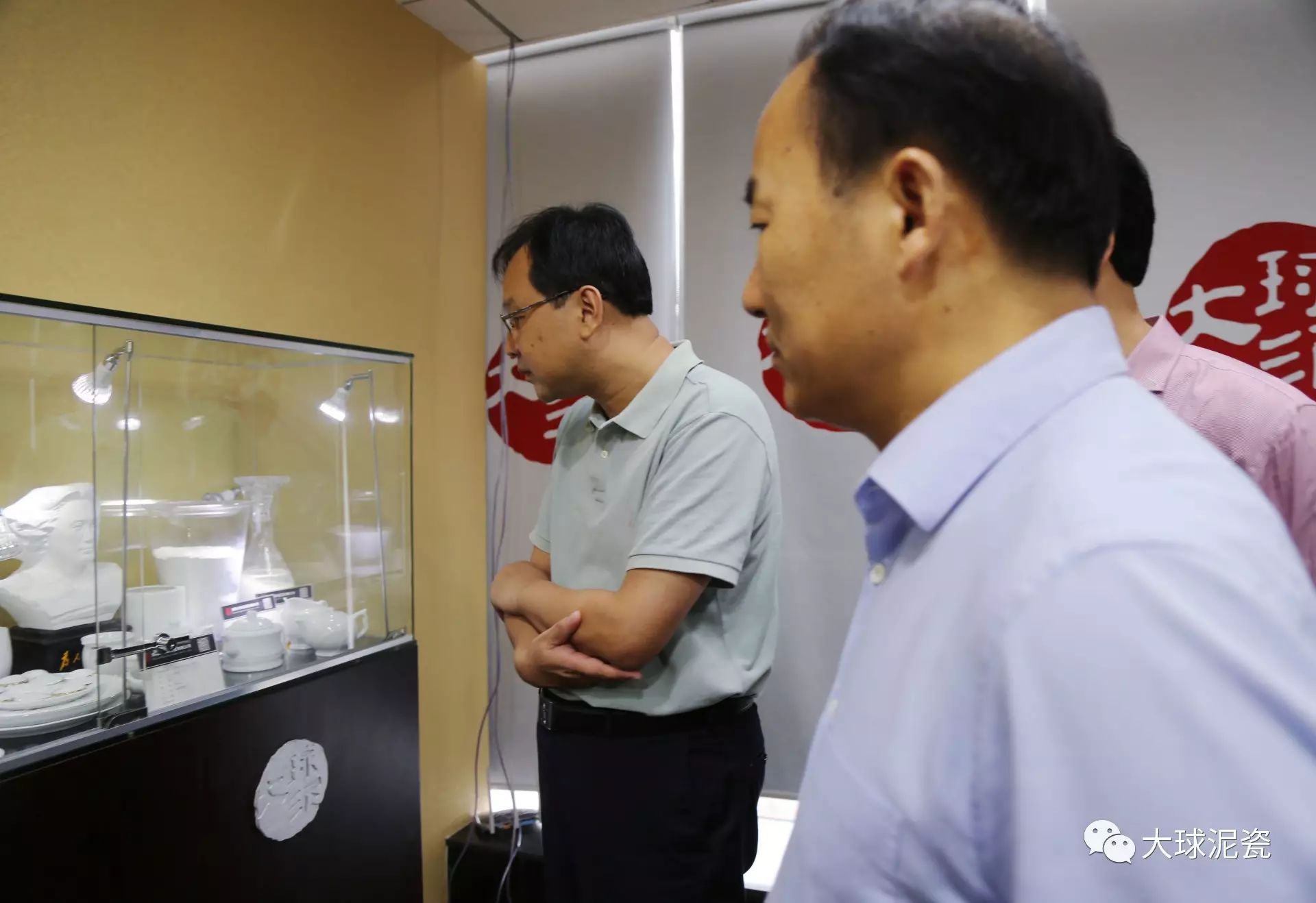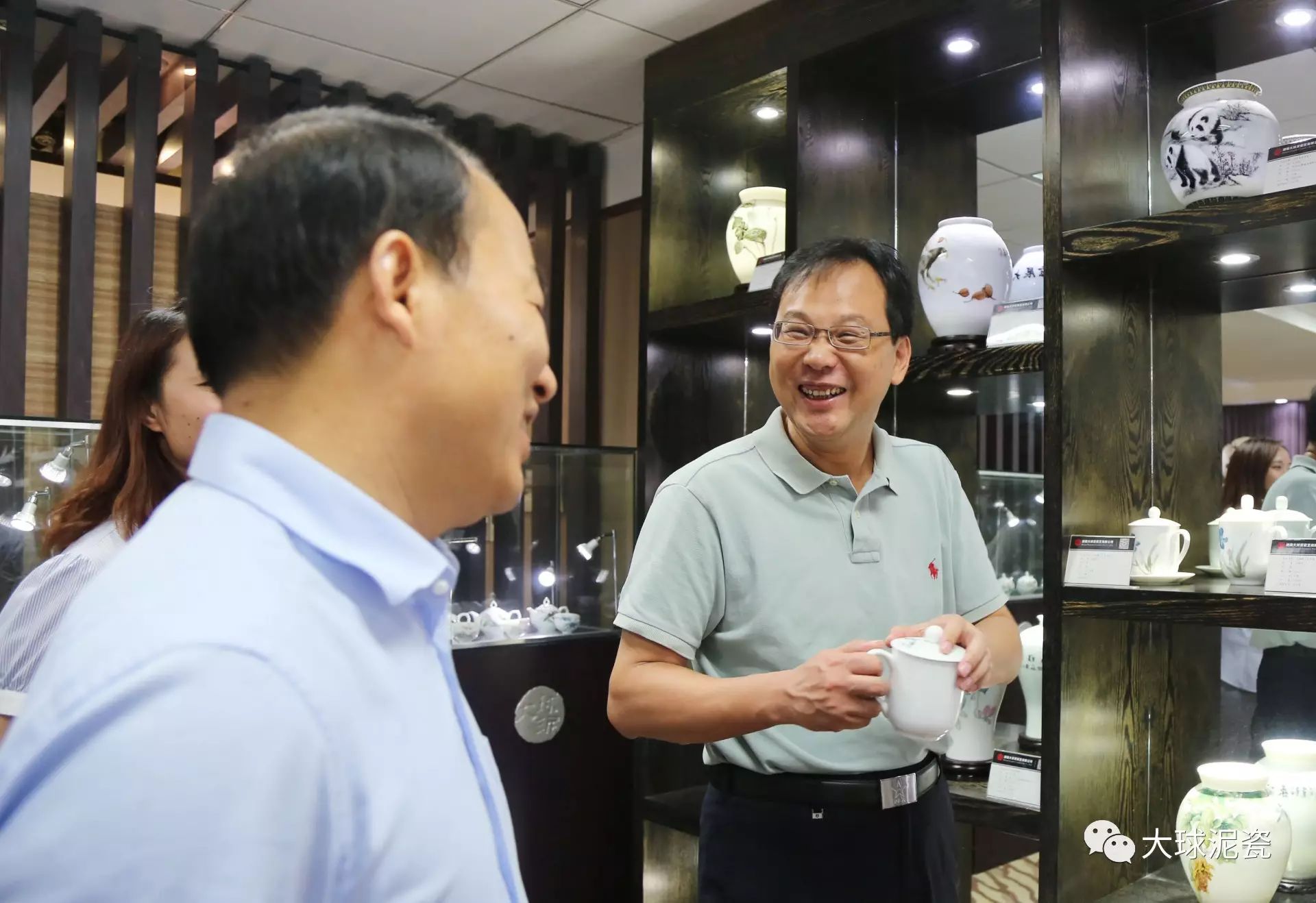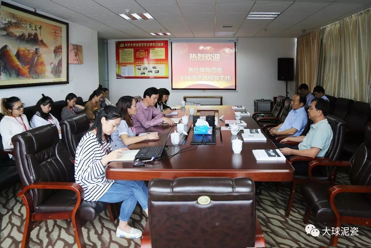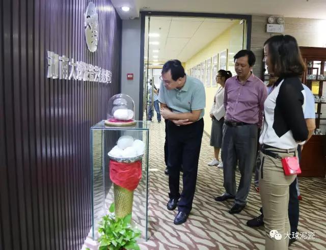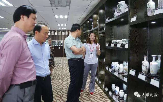 程主任、高部長一行在滕董的陪同下參觀了大球泥瓷精品展廳,仔細聽取了工作人員對大球泥原料的形成、發現、存量以及大球泥瓷各種器型、工藝、畫面特點的介紹。