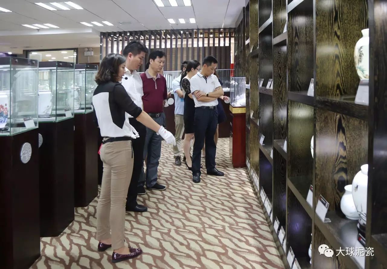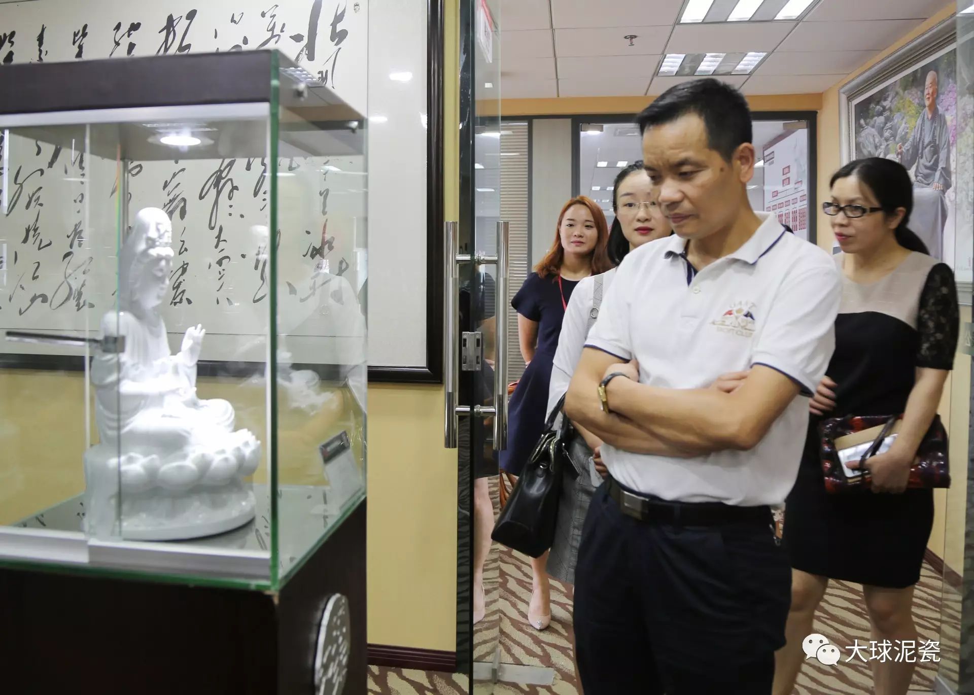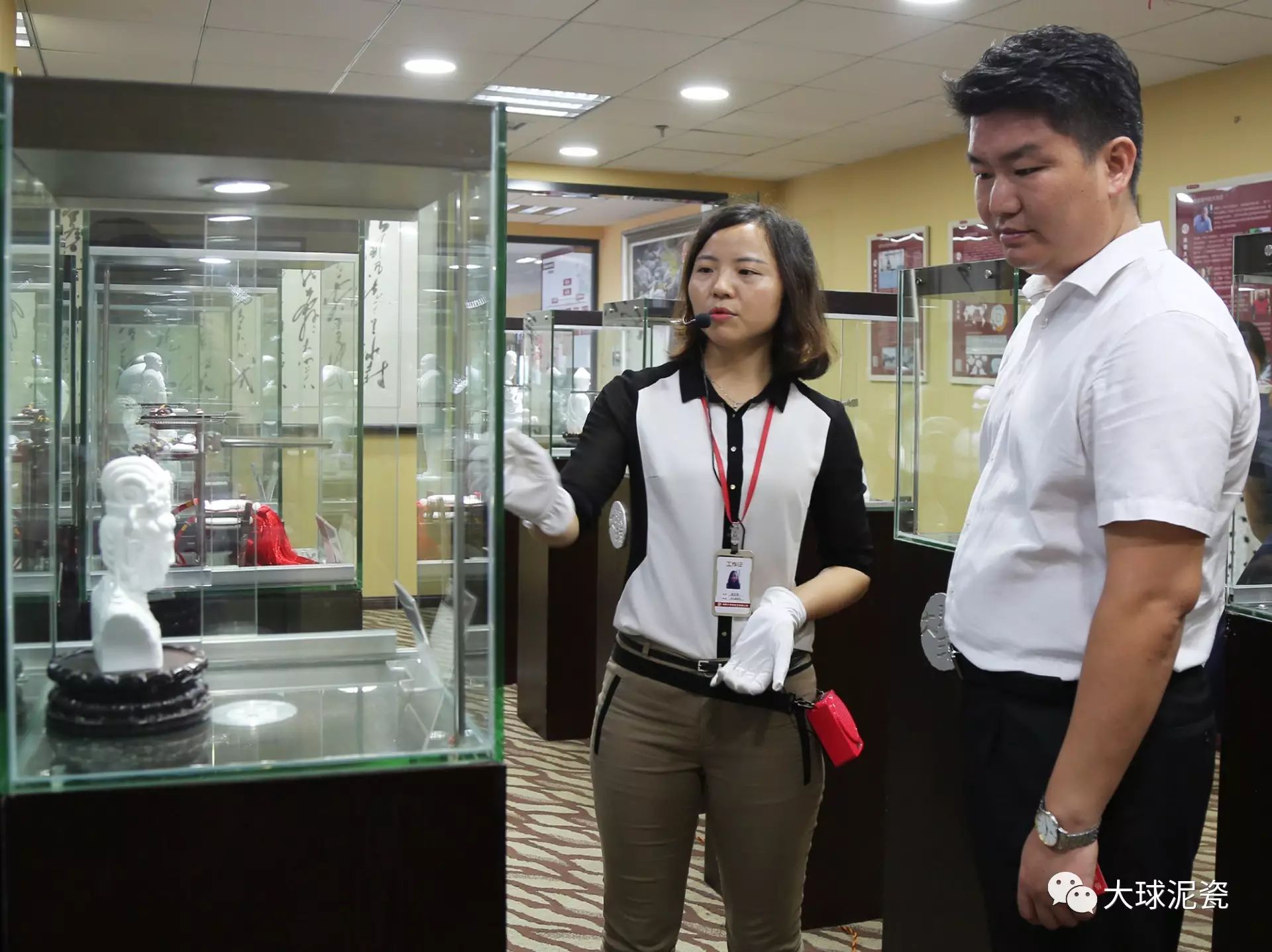 肖部長一行在滕董的陪同下參觀了大球泥瓷精品展廳,仔細聽取了工作人員對大球泥原料保護性收藏、創新創意研發,以及大球泥瓷在佛教系列、紅色系列、高端藝術收藏品、生活用瓷等作品的特點介紹。