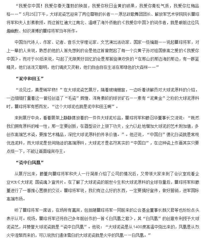 “泥中和田玉,瓷中白鳳凰” 瞿琮將軍蒞臨大球泥瓷藝參觀指導