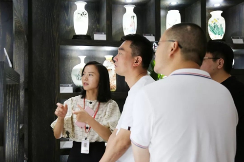 湯總一行首先參觀了公司企業文化展廳和產品展示廳,營銷總監徐亞美作了全程講解。湯總一行對大球泥原料這一核心競爭力表現出濃厚的興趣,認為大球泥精典作品出彩,文化價值和藝術價值非凡,單論白色瓷質的高貴瑩潤,就已是精品,其工藝水平更是高超。