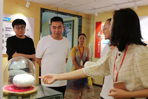 8月8日上午,湖南國際頻道常務副總監(主持工作)湯集安、副總監劉輝、總監助理任帥等一行到大球泥瓷藝考察指導,董事長滕召華、常務副總張萍等陪同考察座談。