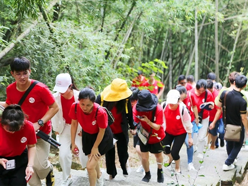 到達(dá)目的地,一句“登頂開(kāi)始”,大伙拋卻了藝術(shù)的身段,甩開(kāi)了膀子,唯恐落后于人。在登山過(guò)程中,越走腳步越沉,越登視野越高,炎熱天氣,暢快淋漓。人說(shuō)登山如人生,在經(jīng)受毅力和耐力的考驗(yàn),在經(jīng)歷困難和險(xiǎn)境之后,登高望遠(yuǎn),隨口吟出——江山如此多嬌!