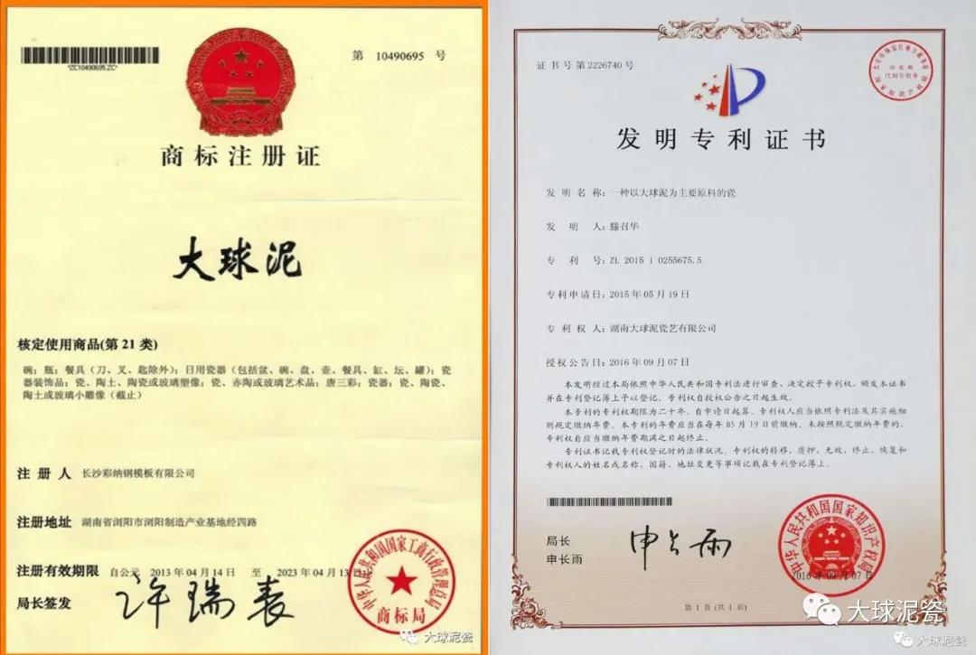 二、“大球泥”是注冊(cè)商標(biāo)。在國(guó)家工商管理總局申請(qǐng)資料上查詢到,2012年1月之前長(zhǎng)沙彩納鋼模板有限公司就申請(qǐng)注冊(cè)“大球泥”這個(gè)商標(biāo),2013年4月14日國(guó)家工商管理總局頒發(fā)注冊(cè)商標(biāo)證書(shū)。媒體報(bào)道,滕召華通過(guò)十余年的不懈努力,前后投入近億元,對(duì)大球泥原料及工藝配方進(jìn)行搶救性保護(hù);組織中國(guó)工程院院士、陶瓷專家、材料專家對(duì)大球泥進(jìn)行深度研究;組織科研人員及工匠,經(jīng)過(guò)上百次的配方試驗(yàn),終于獲得了理想的大球泥煉制配方;突破了高溫釉下五彩藝術(shù)瓷的技術(shù)難題,結(jié)合景德鎮(zhèn)青花、德化白瓷雕塑、宜興紫砂壺、臺(tái)灣琺瑯彩等工藝技術(shù),發(fā)明了大球泥的獨(dú)創(chuàng)燒制方法。湖南大球泥瓷藝有限公司 自2013年注冊(cè)了“大球泥”商標(biāo)之后,又注冊(cè)了“大球泥瓷” 、“大泥球”、 “球泥”、“球泥瓷坊”、“白鳳凰”等一系列商標(biāo)。