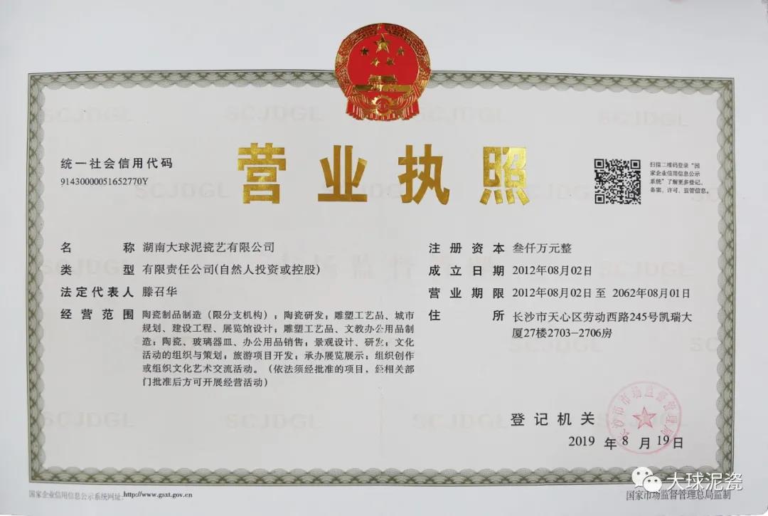三、“大球泥”是知名企業(yè)。在湖南省工商管理局的企業(yè)注冊(cè)登記資料中查詢“大球泥”得知,湖南大球泥瓷藝有限公司于2012年8月2日在湖南省工商管理局注冊(cè)成立并領(lǐng)取營(yíng)業(yè)執(zhí)照,之后又有幾次營(yíng)業(yè)范圍變更,但是名稱一直沿用至今。在百度上查詢“大球泥”是國(guó)家特色文化產(chǎn)業(yè)重點(diǎn)項(xiàng)目、國(guó)家高新技術(shù)企業(yè)、湖南省特色文化產(chǎn)業(yè)示范基地、湖南省雙創(chuàng)示范基地等。該公司是我國(guó)高端藝術(shù)陶瓷《大球泥瓷》地方標(biāo)準(zhǔn)的制定者,擁有專利近百項(xiàng),“大球泥”也是湖南著名品牌。營(yíng)業(yè)范圍為大球泥原料研究,高端藝術(shù)陶瓷定制,文旅項(xiàng)目開(kāi)發(fā),城市品牌策劃,公共文化藝術(shù)工程等領(lǐng)域。