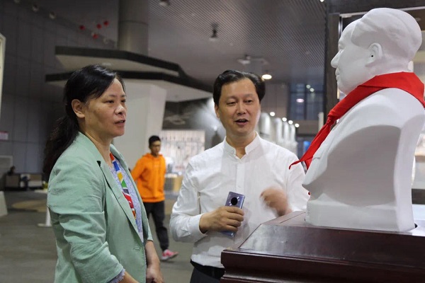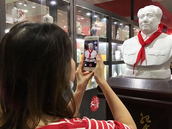 在這款大型瓷雕毛主席像前,大家停駐觀瞻,紛紛與偉人同框留念。紅色題材一直是大球泥瓷藝公司“講好中國故事,傳承紅色基因”的代表作。