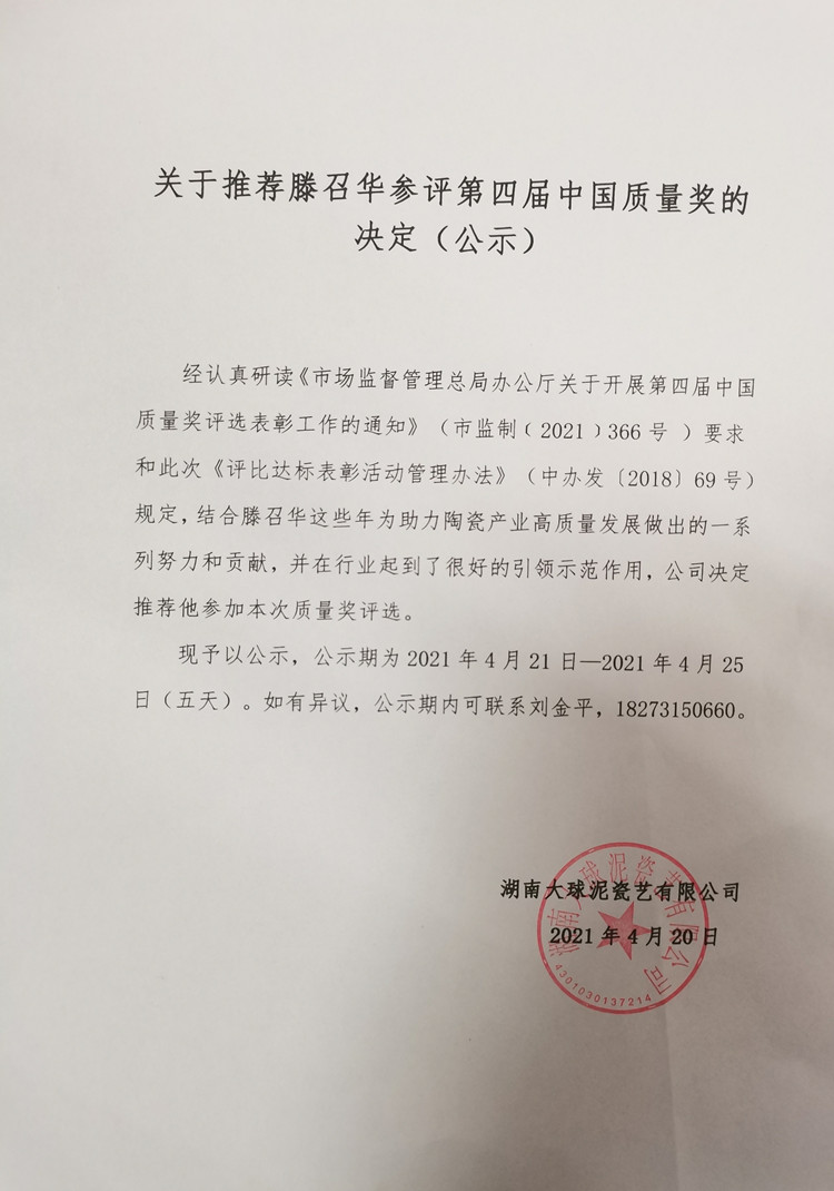 關(guān)于推薦滕召華參評(píng)第四屆中國(guó)質(zhì)量獎(jiǎng)的決定(公示)