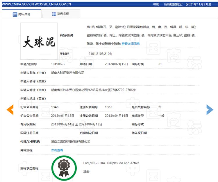 大球泥(國際分類21類)商標(biāo)注冊信息