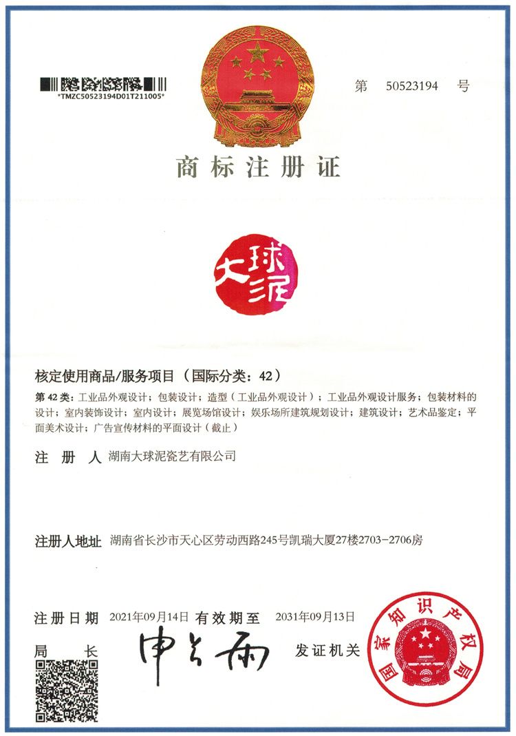 近期,我公司收到國家知識產(chǎn)權(quán)局頒發(fā)的“大球泥”在國際分類42類商標(biāo)注冊證書,這一注冊商標(biāo)的啟用,標(biāo)志著“大球泥”商標(biāo)不僅在陶瓷器具、廣告宣傳等領(lǐng)域受到保護(hù),而且在建筑施工、工業(yè)設(shè)計等領(lǐng)域也受到保護(hù)。