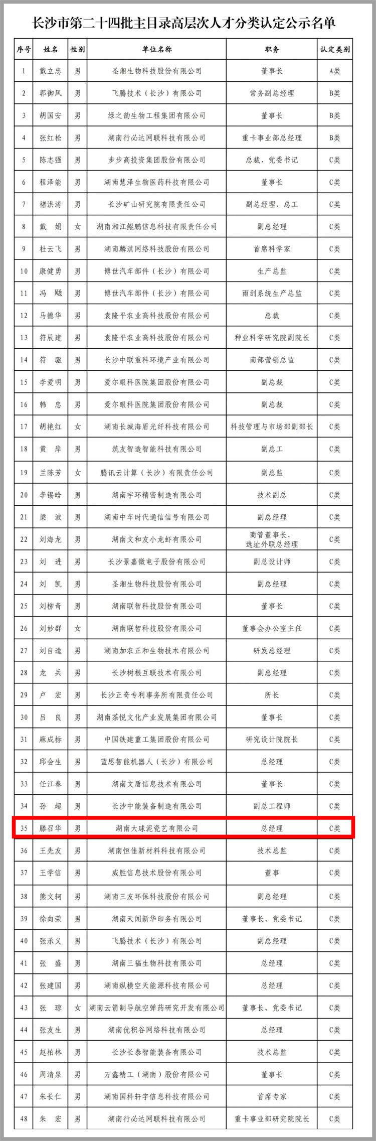 日前,根據(jù)中共長(zhǎng)沙市委人才工作領(lǐng)導(dǎo)小組《關(guān)于印發(fā)<2021年度長(zhǎng)沙市高層次人才分類認(rèn)定目錄>的通知》(長(zhǎng)人才發(fā)〔2021〕1號(hào))文件公告,公司董事長(zhǎng)滕召華正式被認(rèn)定為長(zhǎng)沙市第二十四批高層次人才。