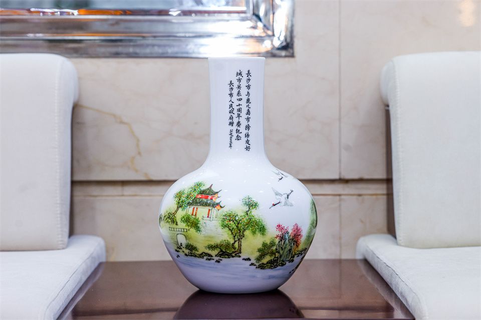 長沙市贈予鹿兒島市的國禮《友誼》瓷瓶,由大球泥集團匠心打造。自接到承制任務后,國家正高級工藝美術師滕召華就帶領設計創作團隊夜以繼日開展工作。經過近兩個月的不懈努力,最終不辱使命、不負重托,高效高質完成了國禮瓷創作任務。