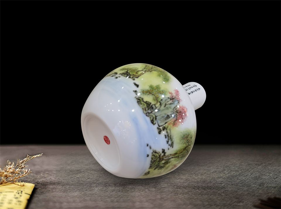 《友誼》瓶,選用中國陶瓷最經典器型,瓶型為直口、長頸、豐肩、圓腹、淺圈足,造型古典端莊,線條優美圓潤。以稀缺大球泥為原料,用釉下高溫工藝三次燒制而成。畫面以兩個城市最具代表性的風景為題材,長沙的岳麓山愛晚亭與鹿兒島的櫻島火山景交相輝映、融為一體,寓意兩個城市山水相依、睦鄰友好、共同發展。