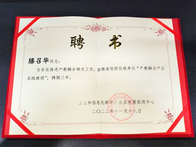 近期,由工業和信息化部中小企業發展促進中心選聘的“產教融合產業實踐教授(第一批)入庫人員”名單正式公布,公司董事長滕召華獲聘教授,這是新年收到了第一個證書。