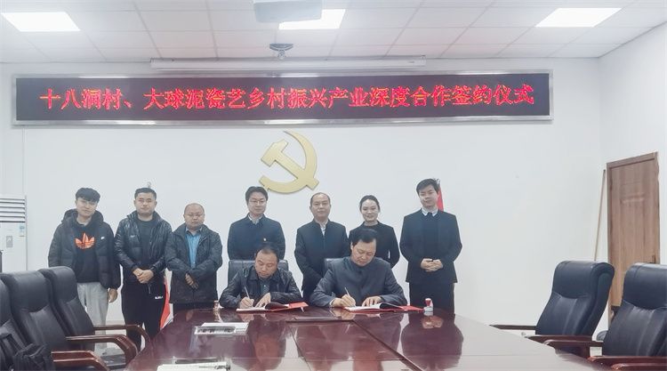 3月17日上午,大球泥瓷藝與十八洞村就鄉村振興產業深度合作在花垣縣十八洞村部簽約。 第二十屆中央候補委員、花垣縣雙龍鎮副鎮長、十八洞村黨支部書記施金通,十八洞村駐村第一書記、鄉村振興工作隊隊長田曉,十八洞村經濟合作社理事長龍書優,公司董事長滕召華、副總經理姚衛、銷售經理吳大樑等出席簽約儀式。