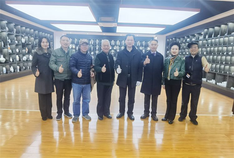 在藝術陶瓷展廳,滕董重點介紹大球泥原料的形成特殊性及存世稀缺性,大球泥原料既是中國獨有的,也是世界上共有的,如何運用非物質文化遺產——釉下五彩燒制工藝作品向世界展示優秀中國文化、傳遞和平友誼,需要國家有關部門大力推介宣傳。滕董講解了為聯合國定制的《和平》套具和外交部定制的《瀟湘風情》咖啡具的設計理念及工藝技術。來訪一行人都為大球泥瓷的工藝精湛、創意十足、寓意深遠而拍照點贊。