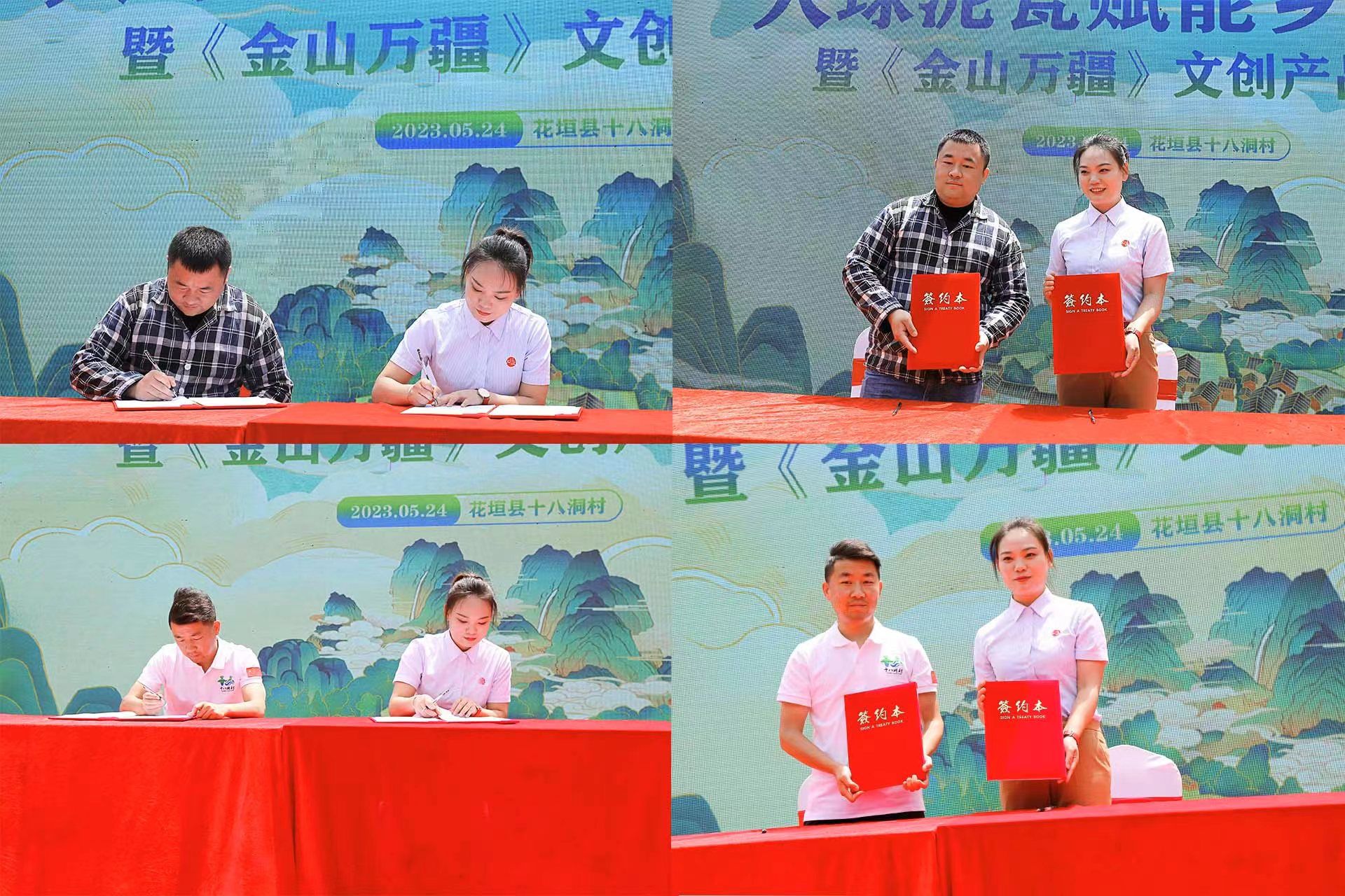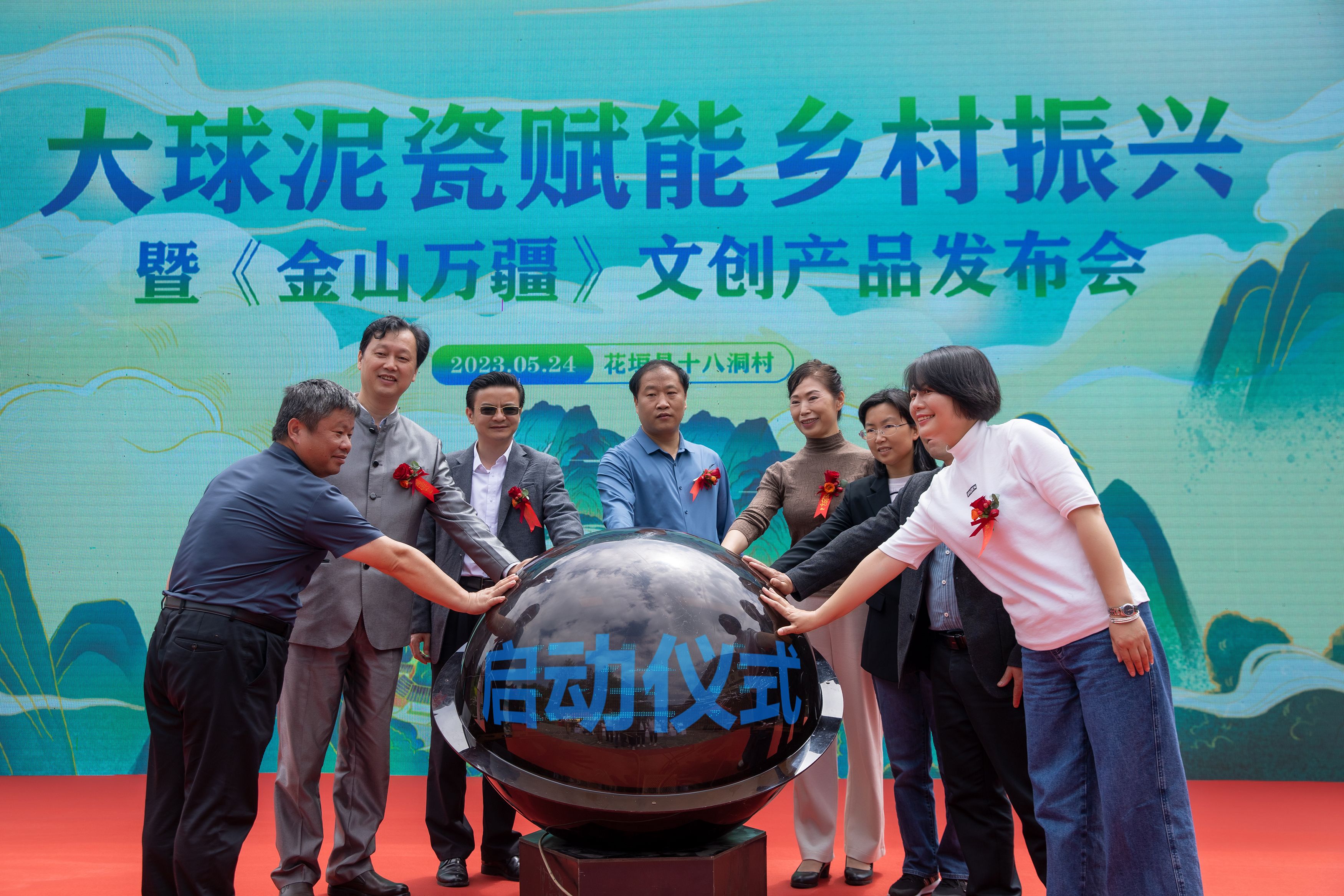 2023 年 5 月 24 日上午,大球泥瓷賦能鄉村振興暨《金山萬疆》文創新品發布會在花垣縣十八洞村村部舉行。省文旅廳三級調研員劉彬、長沙市委宣傳部四級調研員何小紅、湘西州文旅廣局副局長呂冠軍、花垣縣委常委、宣傳部長滕召帆、十八洞村委會副主任、經濟聯合社理事長龍書優等出席。
